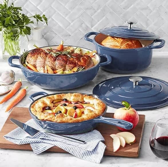 Our 10-Piece Enamelled Cast Iron Cookware Set is the ultimate collection of cast iron cookware, equipping your kitchen with all the essentials for years to come. Featuring a 6.7 L Round Dutch Oven, 4.7 L Oval Dutch Oven, 3.5 L Braiser, 2 L Saucier, 30 cm Iron Handle Skillet, and 4.9 L Rectangular Roaster, this timeless collection will help you prepare all your favourite recipes and tackle new cooking techniques.